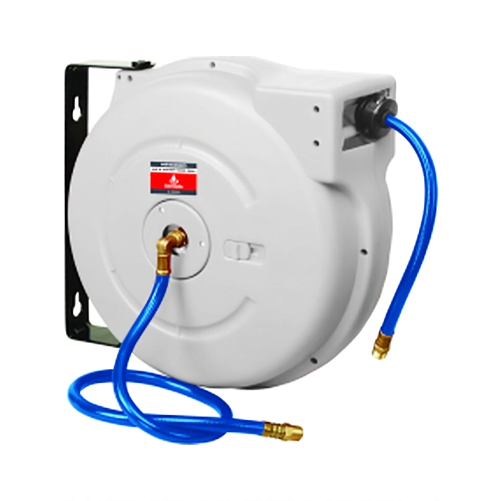 - Automatic spring rewind retrieves, stores & protects air/water hose