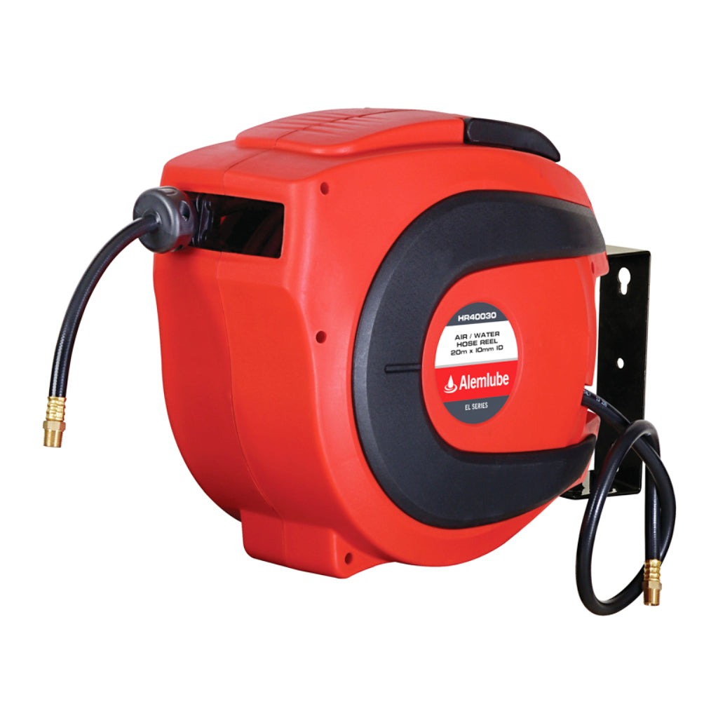 The Alemlube EL Series HR40030 Air / Water hose reels are quality hose handling, retrieval and storage systems each with crimped hose ends, integral carry handle and detachable mounting bracket enabling 180º hose reel rotation. Manufactured with high density impact resistant and UV stabilised polypropylene covers, the HR40030 PVC hose features a positive latching system that automatically locks the hose at the desired length and the heavy duty internal spring assembly easily retrieves the hose when partially or fully extended.