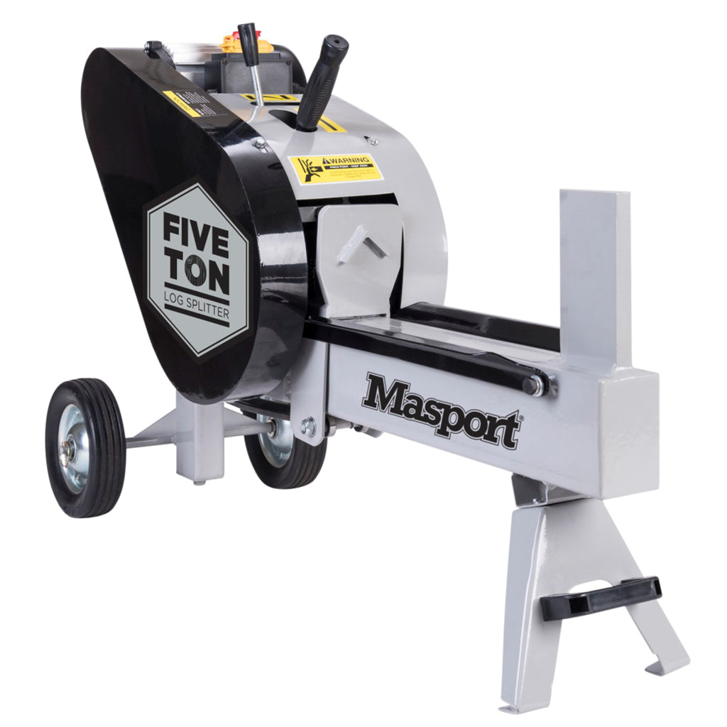 The new Masport log splitter is fast and efficient, utilising the latest in kinetic technology. The electric motor spins twin 6.7kg flywheels at 400rpm which store the kinetic energy generated, then release it in a rapid burst of energy through a rack and pinion system once the operator engages the levers. This pushes the log in an extremely fast motion onto the splitting wedge, quickly splitting it in less than 2 seconds, before quickly resetting, ready to split the next log.